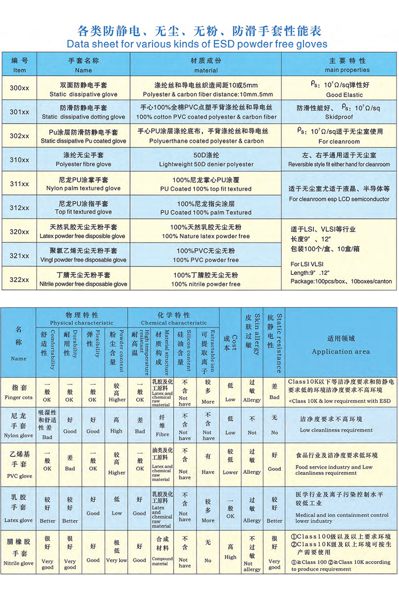 按照IEST-RP-CC005.2潔凈室和其他受控環(huán)境中使用的手套的有關(guān)規(guī)定,潔凈室用手套根據(jù)各種材質(zhì)的潔凈手套,其物理特性和化學(xué)特性是有差異的,而且使用成本和適用領(lǐng)域都不一樣,詳細情況見下表(供參考)。