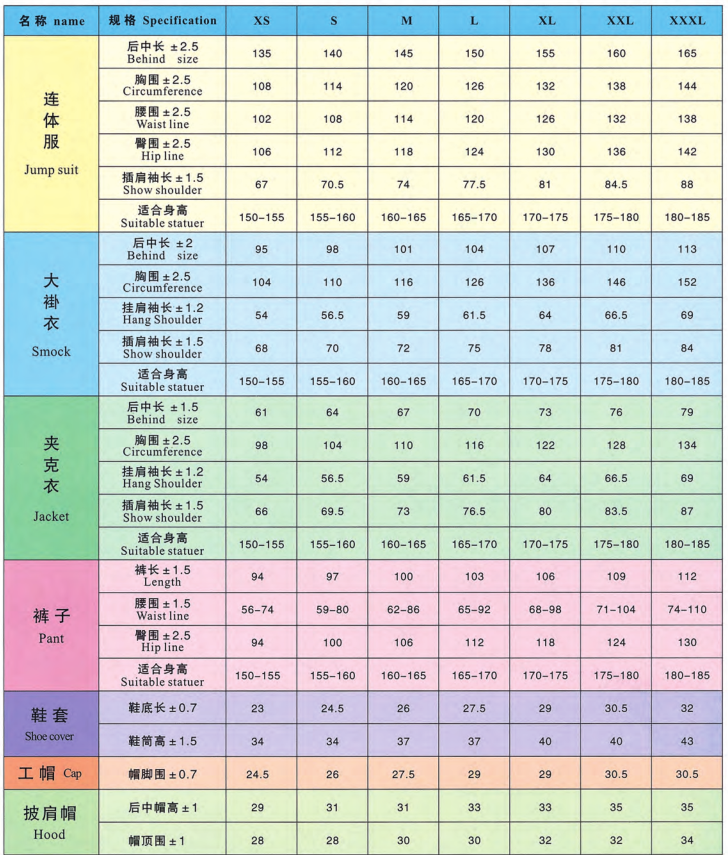 C.The relation between structure & pattern of cleanroom garment and cleanliness classed, see table below