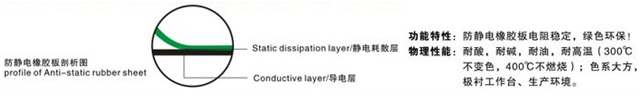 Anti-static rubber mat is made by anti-static and conductive layer of ruber. It is designed to elimate electrostatic charges from operators, tooling, part boxes, packaging bags, component,etc. It can protect the products from damge by the electrostatic acculated on the working table. It is flat and not curl and not affected by humidity. It is strong resistance to abrasion, chemicals, heat resistant,easy to clean and maintain.